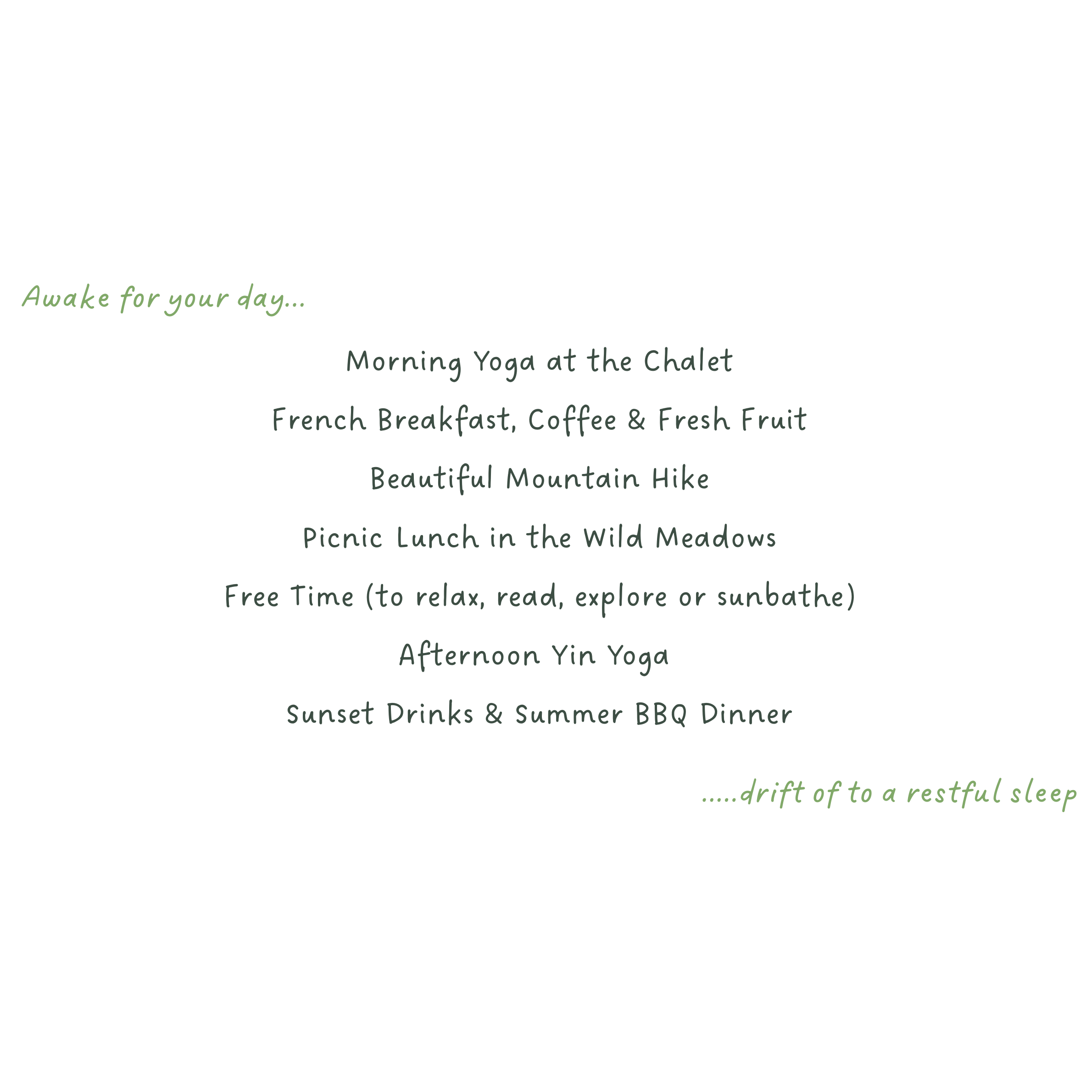 It’s Your Holiday: This is your time to relax, move, and explore - maybe even enjoy a glass of wine on the terrace as the sun sets behind the peaks. Join every session or simply rest, wander, and breathe in the mountain air - this is your reset.
